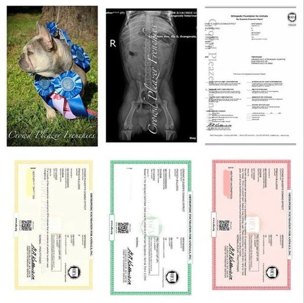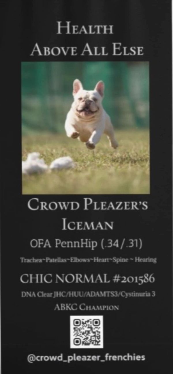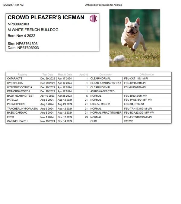 Both sire and dam have OFA NORMAL evaluations for Hips (both are GOOD), patellas, elbows, trachea, and heart. Grandsire is EXCELLENT. Dominion's hips are GOOD as are his littler mate, Dream Workz Azul Haze (PennHip .21 x .21), and CH. Crowd Pleazer's Iceman' PennHip is rated .31 x .34, currently the 6th tightest in the OFA database for French Bulldog PennHip evaluations. His sister's is THE BEST EVER RECORDED PENNHIP FOR A FRENCH BULLDOG as of 6/1/2025. Dom is one of four litermates to have OFA GOOD and/or PennHip Scores in the low .3s and .4s... which confirms OFA's statment of depth and breadth of NORMAL health pedigree