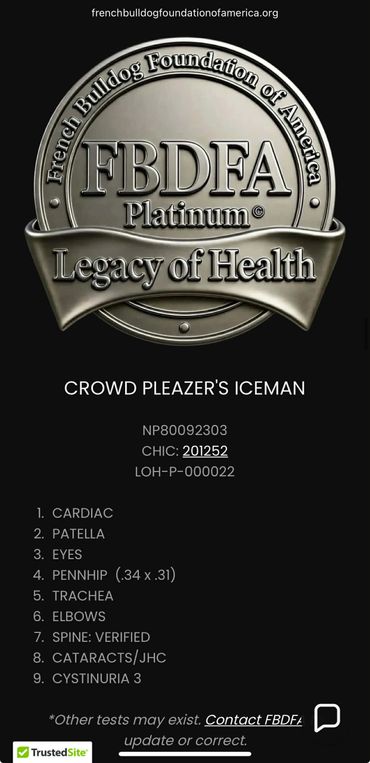 Both sire and dam have OFA NORMAL evaluations for Hips (both are GOOD), patellas, elbows, trachea, and heart. Grandsire is EXCELLENT. Ch. Iceman’s hips are rated .31 x .34, currently the 6th tightest in the OFA database for French Bulldog PennHip evaluations. Iceman is one of FOUR Littermates to score OFA GOOD and or better PnnHip in the low .03s and .04s!