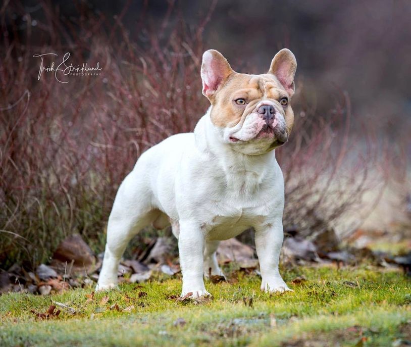 Grand Champion Lilac Haze Bendrix at 26 Months. AKC Lilac Fawn Pied French Bulldog Stud. DNA Health Tested Clear 187+ genetic diseases. OFA Certified Hips (rare EXCELLENT rating), Heart, Elbows, Patella, Trachea. Cystinuria 3 CLEAR!