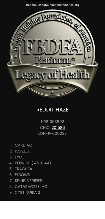 Benny is one of only 739 French Bulldogs to have a CHIC Certification. Of those FBDs, Benny is THE YOUNGEST male with Excellent Hips for all FBDs tested, with only 16 male FBDs to ever be CHIC certified with that rating in 21.5 years of testing.
